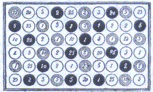 lector tiene que resolver eso. Véase la figura primera y supóngase que los círculos blancos son castaños (lo cual, por sí solo, ya es un lío tremendo); los negros, perales, y los círculos triples, manzanos. Ahora se trata de dividir el campo en tres partes y que en cada parte haya el mismo número de círculos de cada color. Solución.—