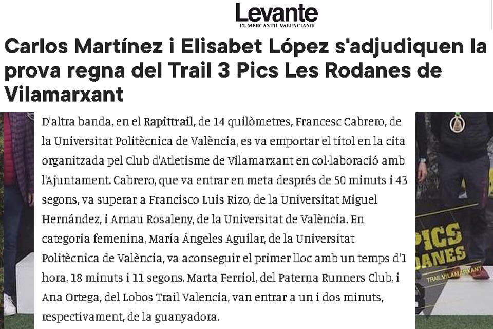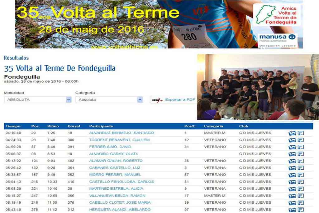 Espectacular demostración del poderío de Guillem Torrent quien una vez más coronó el nombre de C.D.MISJUEVES en lo alto del mítico Mondúver en la que quedó quinto de la General y Tercero de su categoría. Duro recorrido que arrancando desde Xeresa no tiene piedad al encaramarse ya desde sus inicios a los más de 800 Metros del Mondúver haciendo una "criba" de quienes realmente estaban llamados a hacer podium.