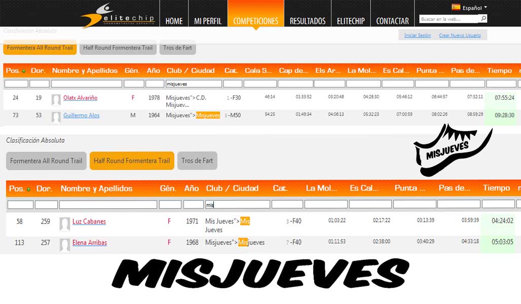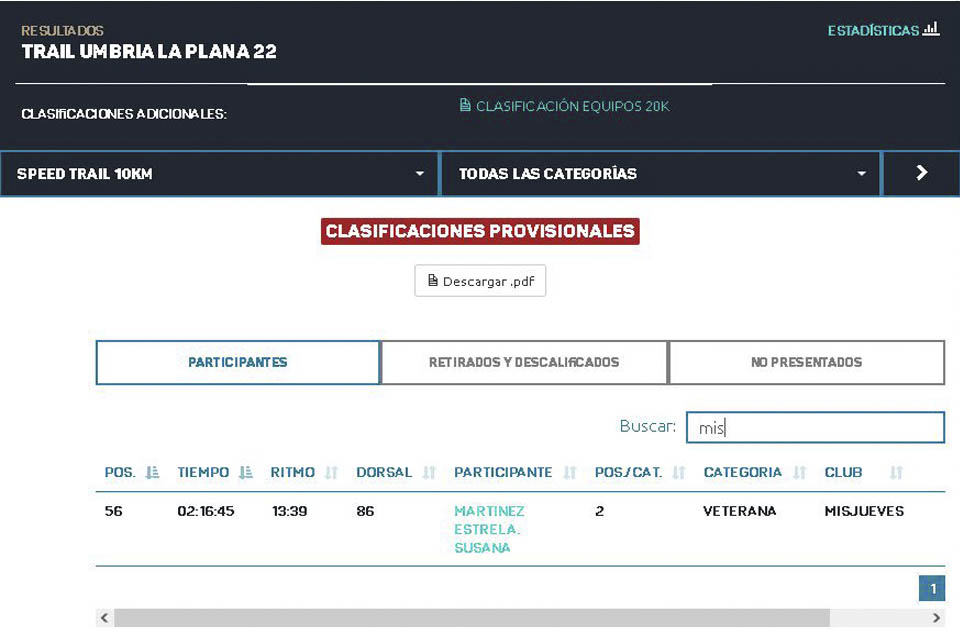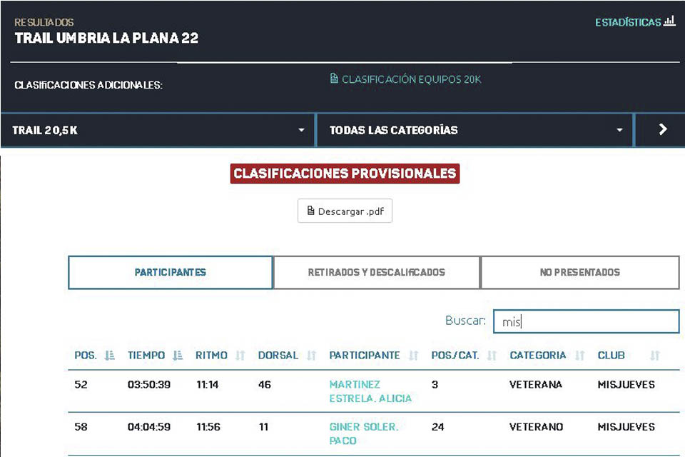 Ana Tortosa decidió una vez más posicionar el nombre de Misjueves en lo alto de los Podiums de un Ultra Trail. En esta ocasión eligió la TES de Espadán. Este evento deportivo cuenta con una distancia de 60 km y registra un desnivel positivo de 3.800 mts que recorren representativas localidades de la sierra "Misjuevera por excelencia": El Parque Natural de Espadán. El recorrido permite disfrutar de repsresentativos y bellos parajes de La Vall d'Uixó, Alfondeguilla, Chóvar, Aín, Eslida y Artana. TES 60 Km: Ana Tortosa Segunda en la General Femenina y Primera en la Modalidad de Pareja Mixta