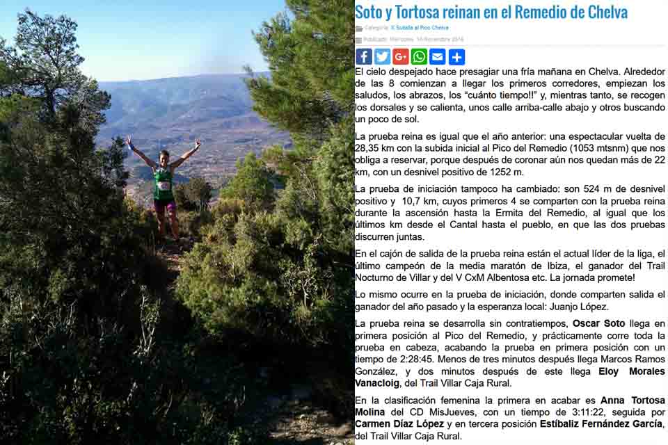 Carrerón de nuestra Misjuevera Ana Tortosa que fue coronando cimas de la serranía del Alto Turia y que, entre otras, trnascurre por el PRV91 y a través de senderos históricos como el Camino Viejo y principal ruta de peregrinación al Santuario Medieval de la Virgen del Remedio.
