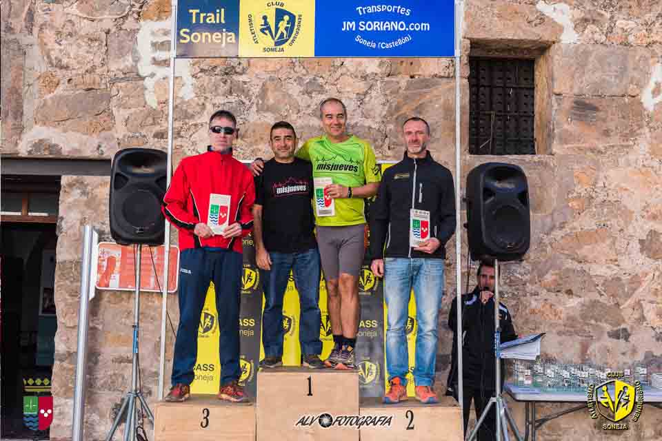 Participación de Misjueveros en El IV TRAIL SONEJA "ALTOS DE PALOMERA", que contaba con una distancia de 21,5 Km y un desnivel positivo de unos 1000 mts. El equipo de MISJUEVES desplegó una estrategia del "1-2" por las sendas del Alto Palancia que acabó con los tres en el podium. Santi ganó en la categoría Máster pero fueron Alberto y José María los que subieron a por el premio del Pastor. Estrategia "1-2"de principio..a fin (Uno gana y DOS suben al podium). 21,5 Km: Santi 1º Máster