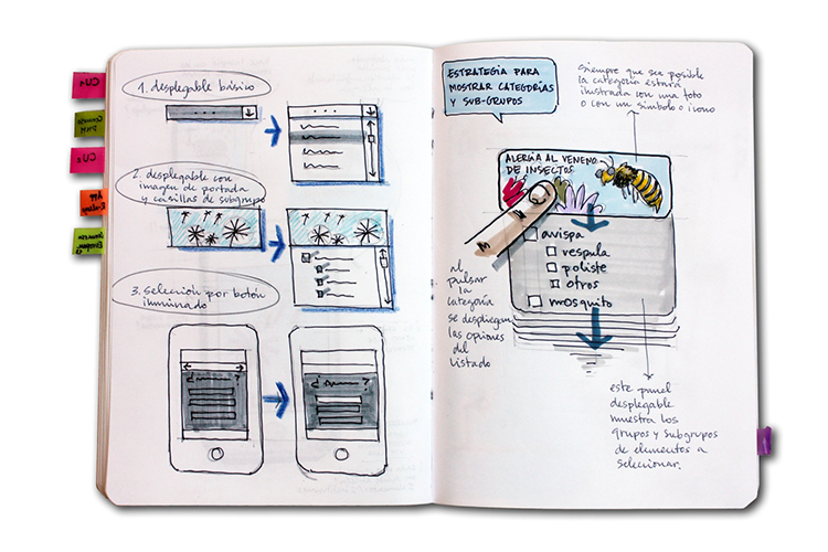 Los primeros pasos en el diseño nos llevaron a diseñan varias pantallas de inicio con diferentes logotipos, paletas de colores y tipografías. En esta etapa se definió un estilo visual y se desarrolló una plantilla básica de pantalla que quedó dividida en 3 partes: El banner superior, el espacio intermedio principal y el banner inferior. Por su parte se definió el estilo gráfico a utilizar en los botones de la aplicación buscando criterios de accesibilidad y sencillez de uso. La estrategia de comunicación visual que se buscó tenía como objetivo permitir al usuario la introducción de una gran cantidad de datos personales y de seleccionar datos entre largos listados, sin que por ello la navegación a través de la aplicación resultara demasiado aburrida o tediosa. Con este propósito se decidió diseñar las pantallas de introducción de datos como las de un cuestionario. En las siguientes pantallas se ofrecen algunos de los bocetos empleados en el diseño y la evolución del icono de la app.
