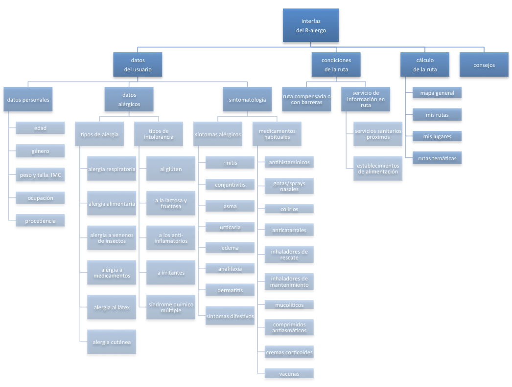 Para el Diseño gráfico de la aplicación se analizaron diferentes modelos de interfaz provenientes de otras Apps disponibles en el mercado, que poseían aspectos de interés de cara al diseño del R‐alergo. Se consultaron aplicaciones como las recogidas en el European Directory of Health Apps 2012‐2013 u otras como la aplicación Alergo Alarm desarrollada por la Sociedad Española de Alergología e Inmunología Clínica (SEAIC).