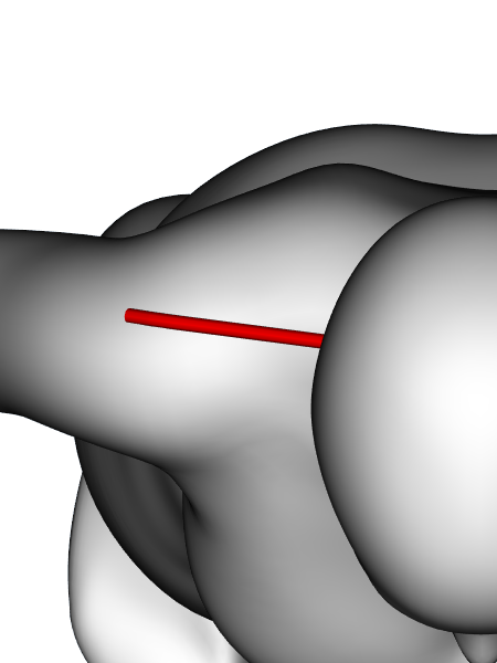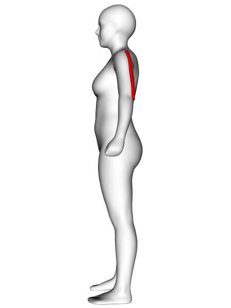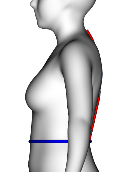 Definition: | Distance from the left side neck point to the left shoulder point (virtual tape). The side neck point (ISO 8559-1:2017 3.1.7) is the crossing point of the neck base line and the anterior border of the trapezius muscle. The neck base line (ISO 8559-1:2017 3.2.1) is the line at the neck base defined using a chainette that pases back neck point and the front neck point. The shoulder point (ISO 8559-1:2017 3.1.2) is the most lateral point of the lateral edge of the spine (acromial process) of the scapula, projected vertically to the surface of the skin. | ||