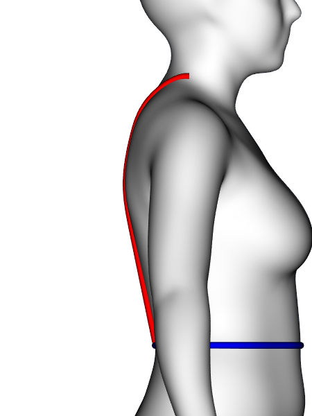 Definition: | Vertical distance from the back neck point to the hip level (virtual anthropometer). The back neck point (ISO 8559-1:2017 3.1.6) is the tip of the prominent bone at the base of the back neck in the mid-sagittal plane, and projected posteriorly to the surface of the skin. The hip level (ISO 8559-1:2017 3.1.25) is the level of the greatest projection at the back of the body (buttocks). | ||
