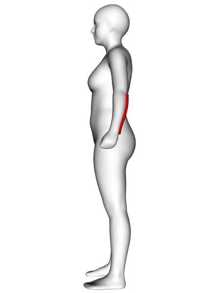 Definition: | Vertical distance from the waist level to a point level with the midpoint of the back of the knees. Waist is the part of the torso at the location between the lowest rib and hip identified by bending the torso to the side (equivalent to waist level used in other definitions). Knee is the joint between the lower and upper leg (equivalent to centre point of the knee cap used in other definitions). | ||