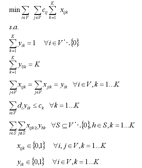 Para un conjunto i, j de nodos del grafo, se expresa la función objetivo que intentará minimizar el coste total de todos los arcos recorridos en la solución. La variable binaria Xijk indica si el vehículo k tendrá una ruta utilizando el arco ij. Mientras, la variable binaria Yik indica si el nodo i con demanda di será atendido por el vehículo k con capacidad Ck. Como se puede ver en la primera restricción cada nodo cliente deberá ser atendido únicamente por un vehículo (en el problema básico CVRP). En cambio del nodo origen 0 pueden partir todos los vehículos K de la flota. A continuación aparecen las restricciones de continuidad donde el vehículo que llegue a un cliente deberá también partir desde él. Tan sólo faltan las restricciones de capacidad: la demanda atendida por un vehículo (suma de di) no debe exceder su capacidad Ck. En el caso en que todos los vehículos tengan la misma capacidad, los valores Ck serán iguales. Por último aparecen condiciones de Miller y Tucker , y la definición de variables binarias.