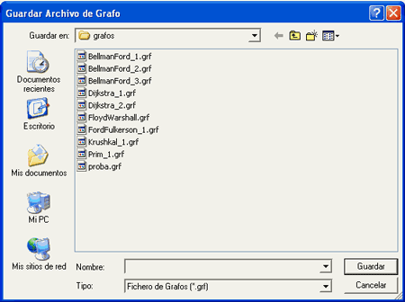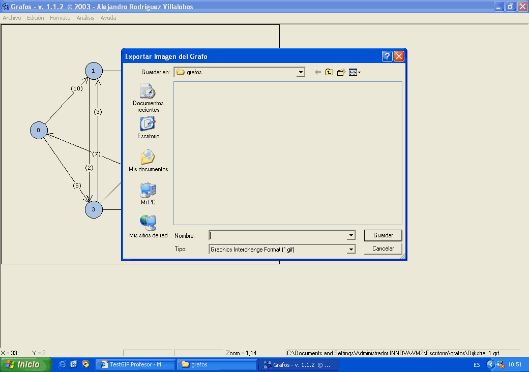 Exportar imagen (Ctrl+E): Exporta el dibujo del grafo a un archivo con formato (.gif, .tif, .png, .bmp). El programa presenta una pantalla en la que solicita el nombre y la ruta del archivo a exportar. Tras aceptar, el programa generará un fichero en el formato indicado.