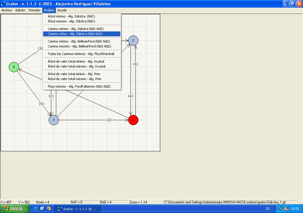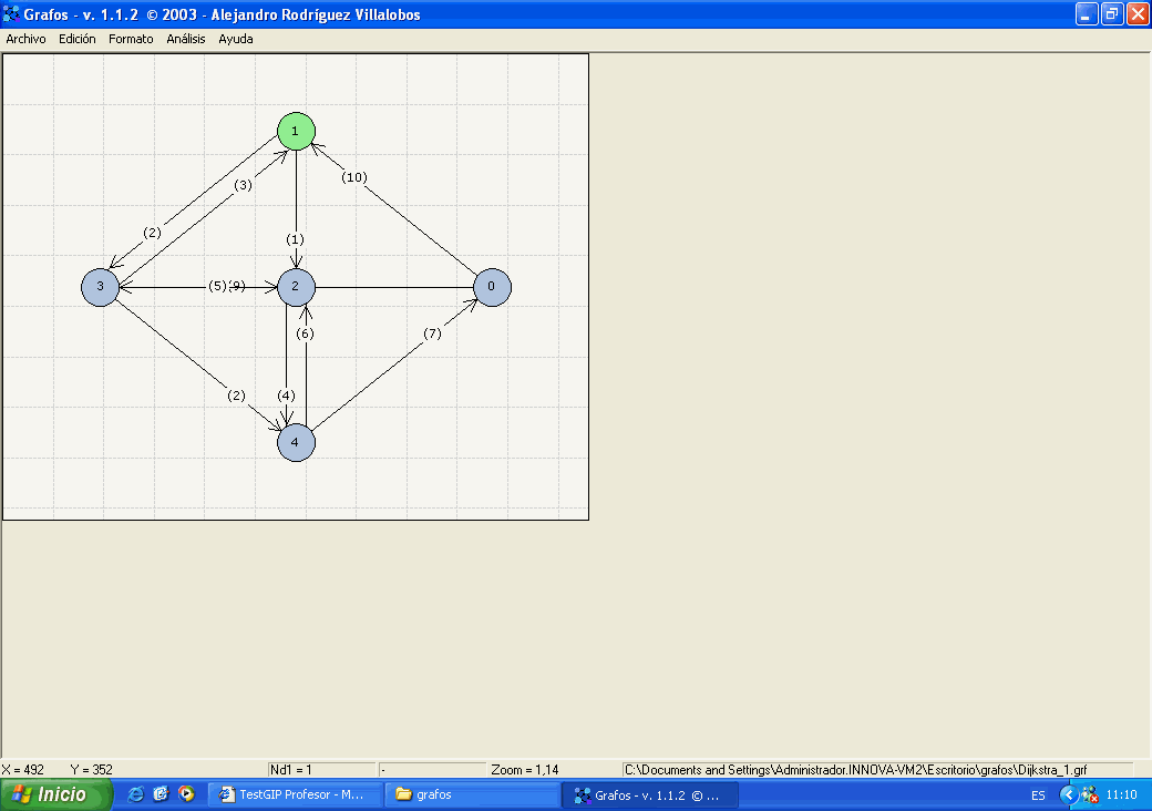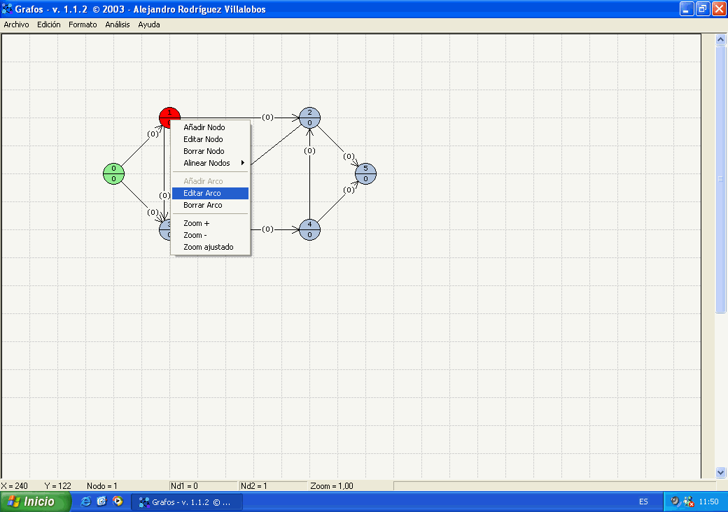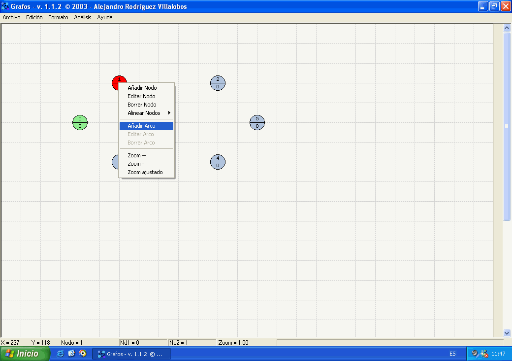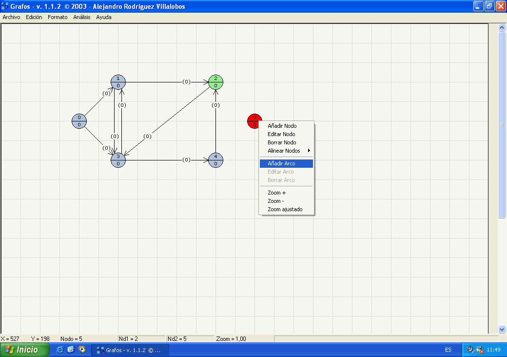 Una vez creados los nodos, hay que crear los arcos que unen cada nodo, para ello hay que pinchar con un click del botón izquierdo del ratón en el nodo inicial y un click del botón derecho en el nodo final del arco, con lo que los nodos cambiaran de color, quedando el inicial de color verde y el final de color rojo. Volverá a aparecer el anterior menú contextual, en el que hay que seleccionar la opción añadir arco, tras lo cual quedaran los dos nodos conectados por el arco, esta operación se deberá repetir con todos los arcos del grafo, quedando el ejemplo como se aprecia en las siguientes imágenes.