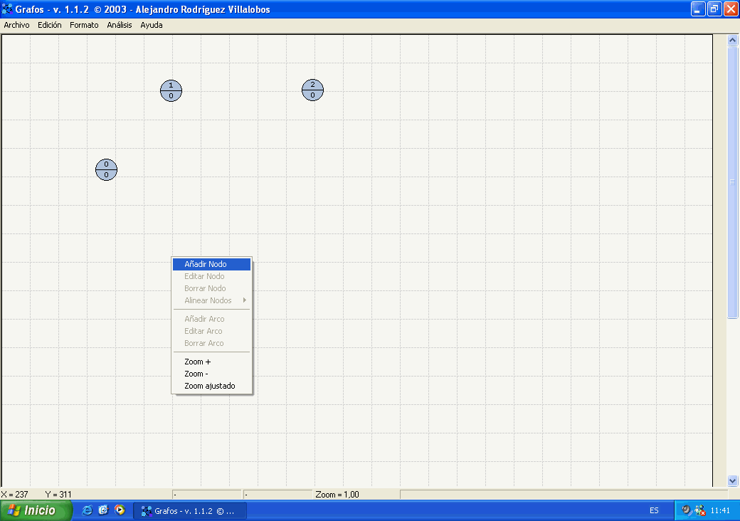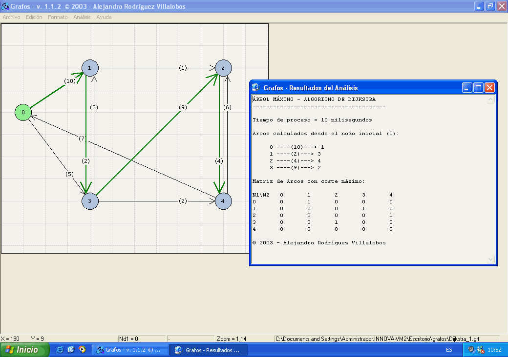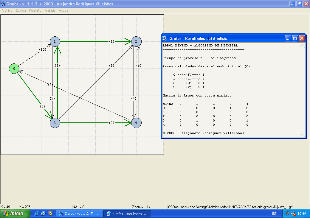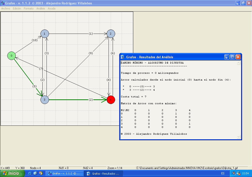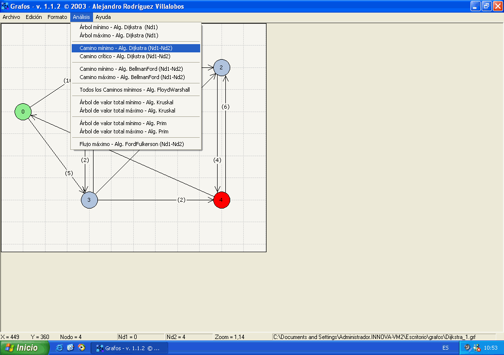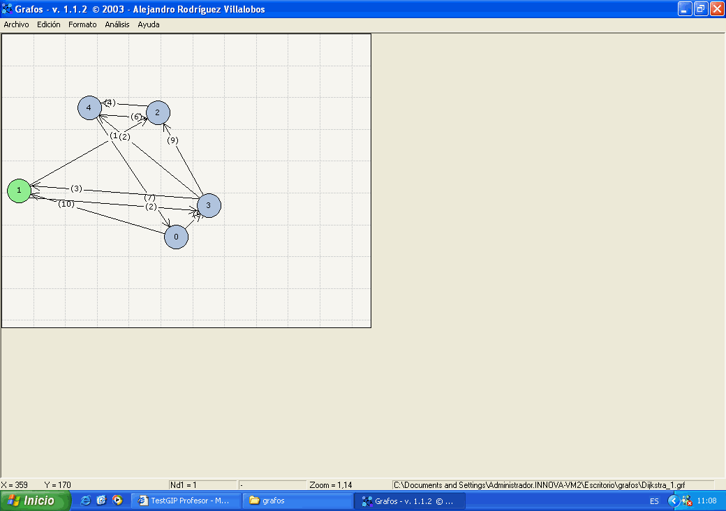 Una vez creados los nodos, hay que crear los arcos que unen cada nodo, para ello hay que pinchar con un click del botón izquierdo del ratón en el nodo inicial y un click del botón derecho en el nodo final del arco, con lo que los nodos cambiaran de color, quedando el inicial de color verde y el final de color rojo. Volverá a aparecer el anterior menú contextual, en el que hay que seleccionar la opción añadir arco, tras lo cual quedaran los dos nodos conectados por el arco, esta operación se deberá repetir con todos los arcos del grafo, quedando el ejemplo como se aprecia en las siguientes imágenes.
