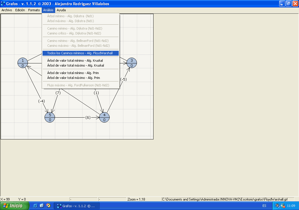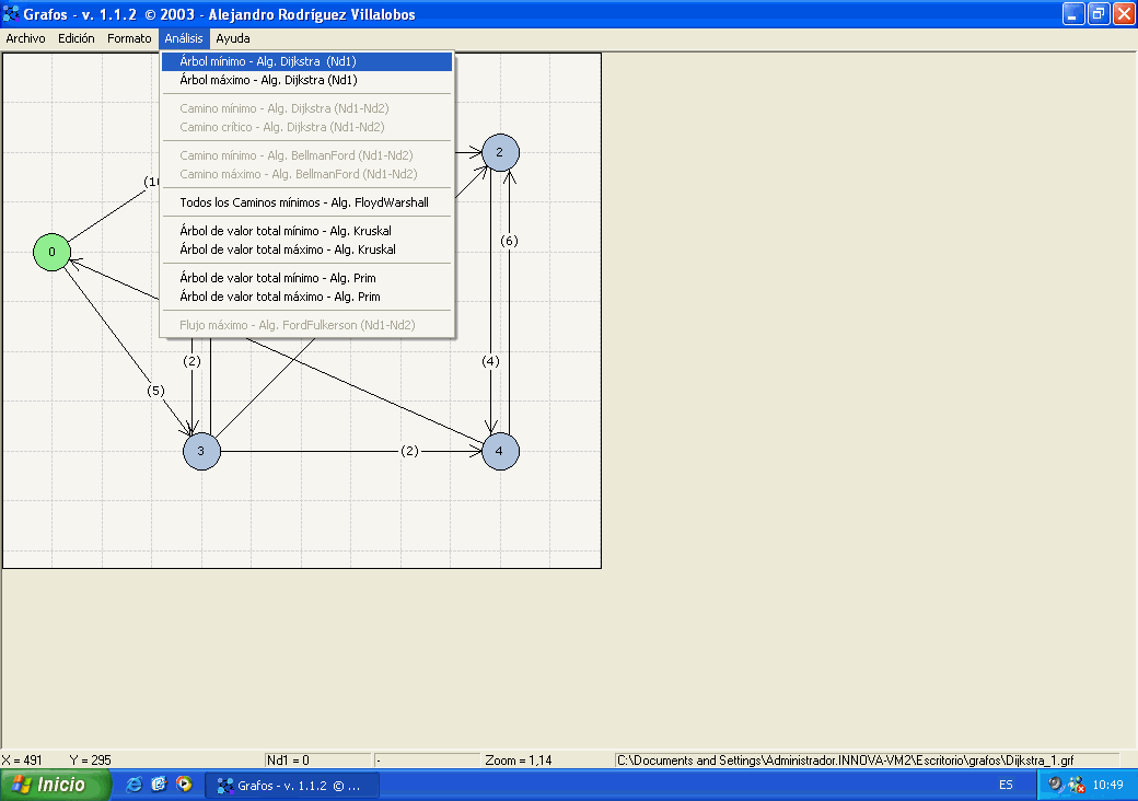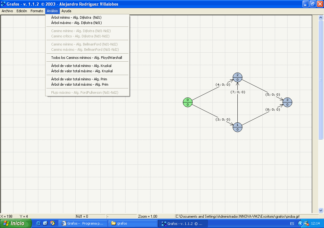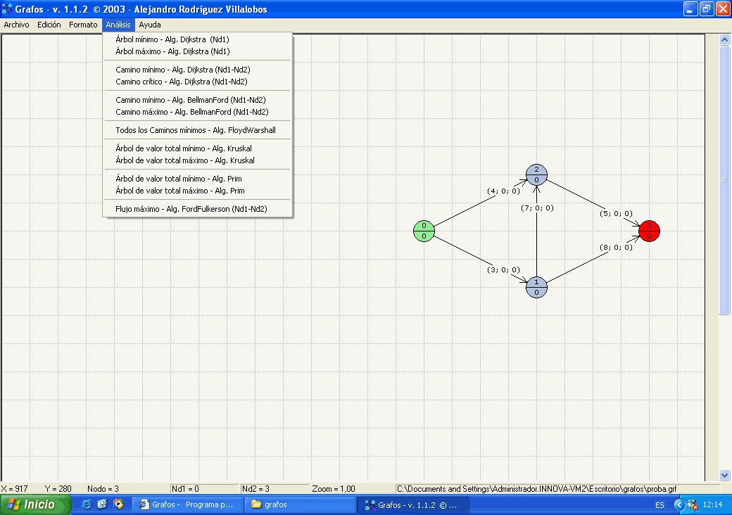 En el menú Análisis, se encuentran todas las posibilidades de aplicación de algoritmos, para resolver y analizar los grafos creados. Las opciones disponibles, dependen del numero de nodos del grafo seleccionados (algunos algoritmos necesitan como dato de entrada un nodo inicial Nd1 en verde, mientras que otros algoritmos requieren de un par de nodos seleccionados, uno inicial Nd1 en verde y el final Nd2 en rojo). Cuando se aplica un análisis a un grafo, rápidamente el programa presentará en pantalla el resultado en una ventana con los datos numéricos y también gráficamente en el grafo. Esto se puede apreciar más adelante, en las pantallas correspondientes a los ejemplos de aplicación de los diferentes algoritmos de cálculo.