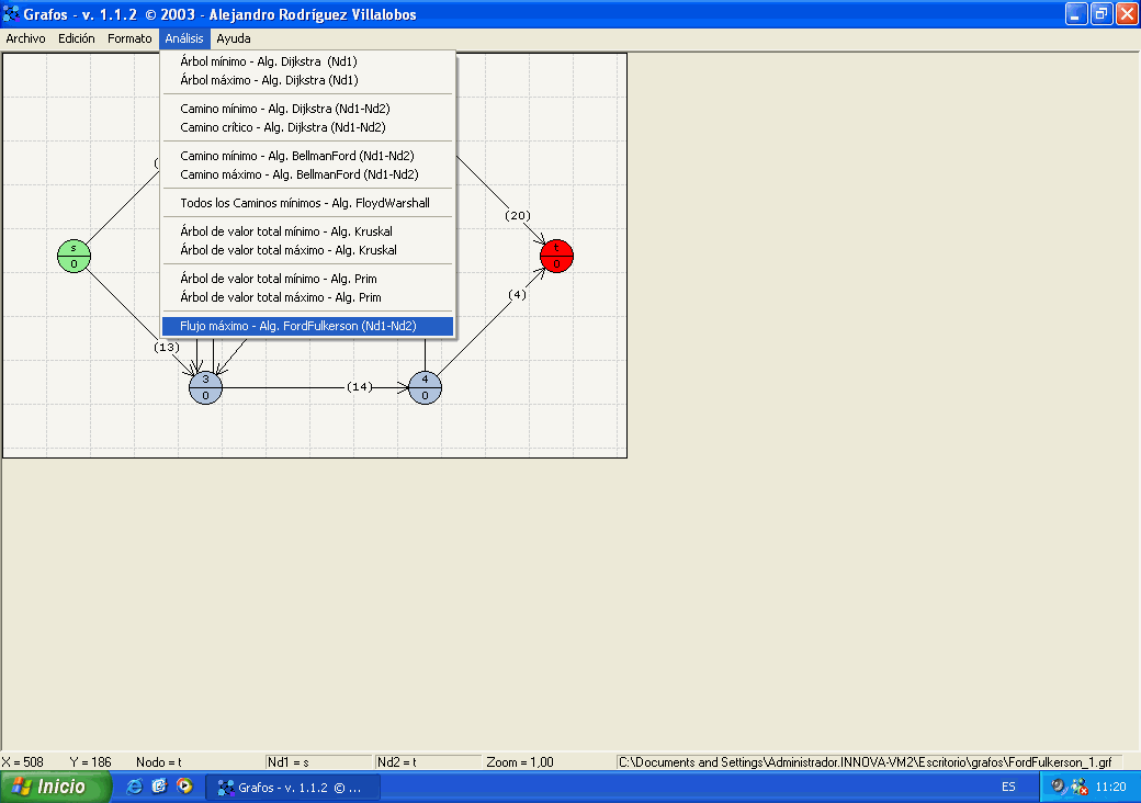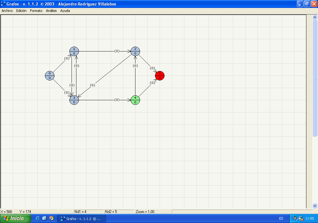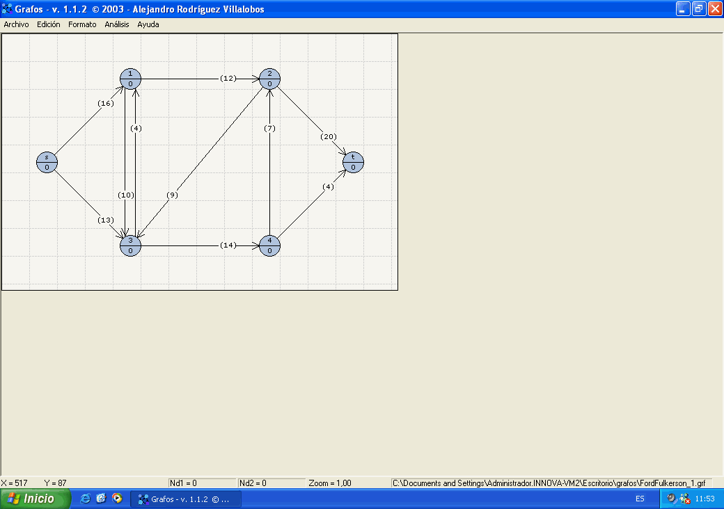 En las siguientes pantallas se va a realizar el proceso de creación del siguiente grafo paso a paso, para su posterior análisis de flujo, mediante el algoritmo de Ford-Fulkerson.