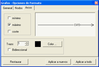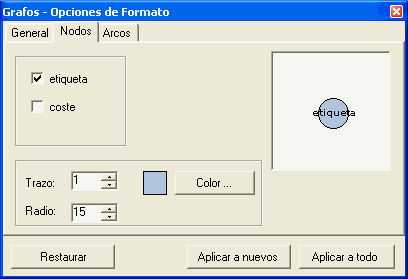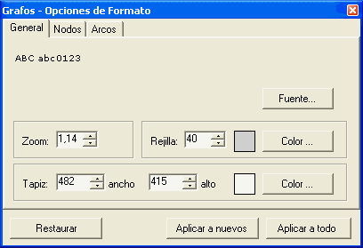 En la parte inferior del cuadro de dialogo, hay tres botones, el primero "Restaurar", permite dejar los parámetros como estaban antes de modificarlos, el siguiente "Aplicar a nuevos", aplica los cambios establecidos únicamente a los grafos que se creen a partir del momento de los cambios y el ultimo "Aplicar a todo", aplica los cambios al grafo que se tenga en el espacio de trabajo. Las opciones de carácter general serán aplicadas igualmente a todo el grafo, como por ejemplo el color del fondo, la rejilla, u opciones como Bidireccional.
