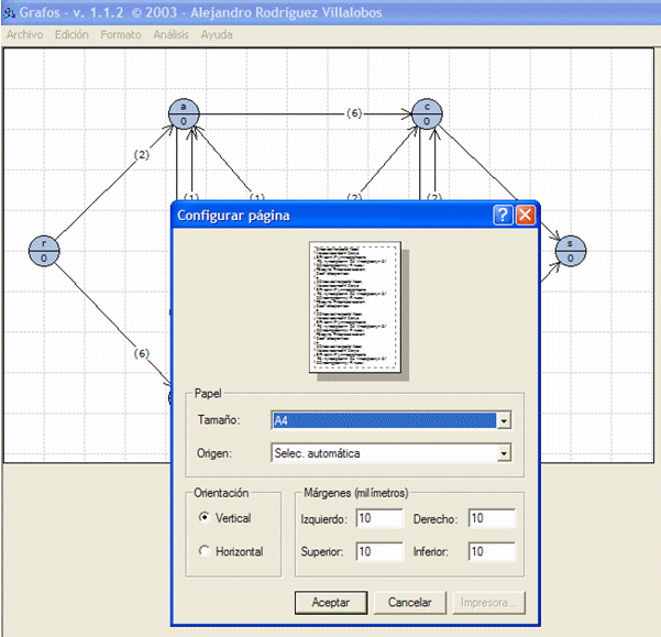 Configurar página: Al igual que la función anterior, podrá configurar el tamaño de papel en el que desea imprimir el grafo, la posición del mismo, y los márgenes de impresión. Tenga en cuenta que el tamaño de la imagen a imprimir será el de su visualización en pantalla, por lo que tendrá que combinar esta configuración con el uso del Zoom de la pantalla para cambiar la escala de la imagen.