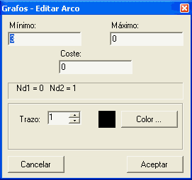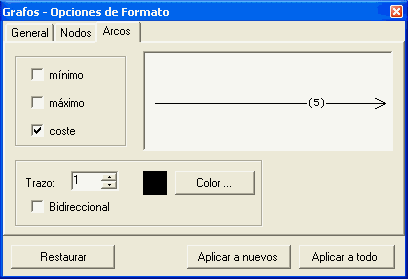 La tercera pestaña llamada "Arcos", permite modificar los parámetros referentes a los arcos del grafo. Al igual que la opción anterior, permite seleccionar los elementos del arco a mostrar, que pueden ser el flujo mínimo, el flujo máximo, el coste, o todos. Esta opción es importante ya que identifica también la interpretación de los datos introducidos en modo tabular (que deben ser introducidos separados por el signo punto y coma). También permite modificar el grosor del trazo que representa gráficamente al arco, así como su color. La casilla "Bidireccional", representa la posibilidad de que el programa al detectar que hay arcos que unen dos nodos en sentido contrario pero con valores de flujo o coste iguales, sean dibujados como uno solo pero con puntas de flecha en ambos extremos. En caso de que los arcos tuviesen diferentes valores, serian dibujados como dos arcos diferentes aunque esta casilla esté activada.