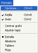 Las siguientes opciones del menú Formato, representan la forma de dibujar en pantalla un grafo abierto mediante la opción "Abrir", o un grafo creado de forma tabular.