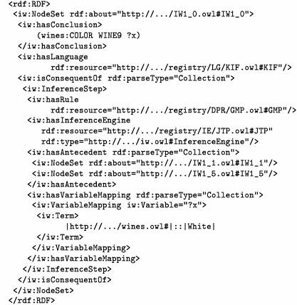 Node Sets e Inference Steps La figura 2 presenta un vaciado típico de un NodeSet. Un NodeSet representa un paso (step) en una demostración cuya conclusión es justificada por cualquier paso (step) del sistema (set) de pasos inferenciales (InferenceSteps) asociados al NodeSet. PML adopta el término "sistema de nodos"(node set) puesto que cada instancia del NodeSet se puede ver como un sistema de nodos recolectados de uno o más árboles de demostración que tienen la misma conclusión. La propiedad iw:hasConclusion de un NodeSet representa la expresión concluida por el paso (step) de la demostración. Cada NodeSet tiene una conclusión, que se representa en el lenguaje especificado en la propiedad iw:hasLanguage del NodeSet. En el ejemplo, la conclusión del NodeSet indica que el color de WINE9 es ?x