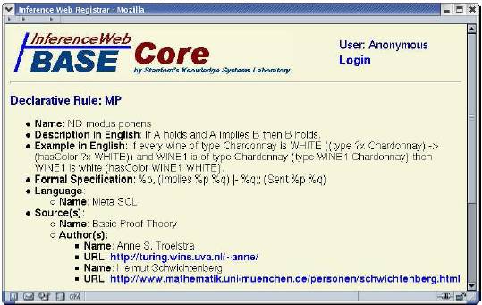 Para registrar formalizaciones de una regla de inferencia La Web Inferencial no tiene un estándar de lenguaje específico para formalizar reglas de inferencia. Con PML, IW proporciona un mecanismo para registrar especificaciones de la regla y los lenguajes usados para ello. En el ejemplo del M.P. la regla se escribe en PPDR, que es un lenguaje para describir las reglas usadas en las demostraciones donde las conclusiones se escriben en KIF. Cualquier instanciación válida de las premisas y la conclusión del M.P. son enunciados válidos en KIF. PPDR es una opción conveniente para la especificación de la regla puesto que fue diseñado para este propósito y la Web Inferencial lo entiende, de manera que le permite dar servicios de abstracción de la demostración. No es la única opción que puede ser registrada – las reglas se pueden especificar en otros lenguajes también. La desventaja de registrar en otros lenguajes es que las herramientas de IW, como los comprobadores de demostraciones (proof checkers), puede que no proporcionen tantos servicios si son lenguajes que las herramientas no pueden entender.