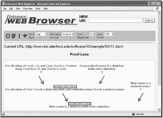 La figura 5 muestra la pantalla del navegador que presenta dos niveles de InferenceSteps para una demostración de un caso de uso del vino. Antes de mostrar la vista, el programa ha preguntado qué vino servir en un curso de mariscos. La figura 5 muestra un fragmento de la demostración que concluye que ese Nuevo-curso (New-course), que es el curso de comida seleccionado, requiere una bebida que tenga un color blanco puesto que es un curso de mariscos. El formato de los enunciados es inglés y la magnitud de la lente es dos, así el navegador muestra los pasos de la inferencia (InferenceSteps) usados para derivar la conclusión del fragmento de la demostración incluyendo sus antecedentes y las derivaciones del antecedente. En cuanto a formatos preferentes de los enunciados, el navegador soporta algunas traducciones restringidas entre enunciados que se pueden solicitar por el usuario. Por ejemplo, el formato "Raw" indica que el usuario desea ver las conclusiones del sistema de nodos (NodeSet) según estaban originalmente. Sin embargo, si el usuario selecciona "KIF", entonces si las conclusiones del sistema de nodos (NodeSet) no están ya en KIF, y el navegador tiene un traductor del lenguaje original a KIF, entonces el navegador traduce y presenta los enunciados en KIF. Si no, presenta el enunciado en su lenguaje original. El mismo método se utiliza para traducir otros formatos, por ejemplo en inglés.