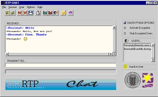 When user pushes the Run button, the main window (Fig. 2), is displayed. This is a typical window for chat programs with the following parts: menu bar, with all the options of the application; icon bar, with icons to do the most common actions; transmission window to write text for transmission; reception window, where all the text messages in the session are displayed; encryption window, to activate the encryption options; users window, to list all the users in a session and facilitate the selection of one of them; and a quick help bar, to give information of the different options when the mouse is over icons and menus. Users only have to write in the transmission window and push Enter to send a sentence to the other participants.