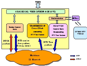 The application uses RTP/RTCP on top of UDP. RTCP is used to convey information in a multicast environment and RTP to transport text information. RTP/RTCP properties allow the application to control situations with packet loss, out-of sequence delivery, synchronisation problems, etc. The use of RTP/RTCP allows the tool to inter-work with other RTP-compliant products.