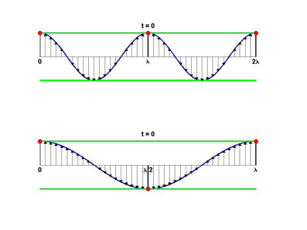 - Se muestran dos ondas con la misma velocidad de propagación. La frecuencia de la primera es el doble que la de la segunda, y por tanto la longitud de onda es la mitad.