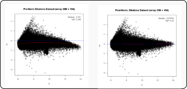 Pero eso no sucede debido a los diferentes propiedades del marcaje. La normalización de Lowess tiene en cuenta esto y que la variación cambia según la intensidad. Hace regresiones en cada región del array y el modelo se basa en el log(Rojo/Verde).