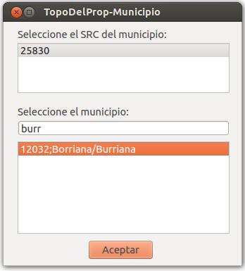 Inmediatamente después de conectar, se solicita un SRC y el municipio que se desea cargar. El único municipio que tiene datos es Burriana, del sistema de coordenadas 25830. Pinche en la lista sobre 25830 y, en el cuadro de texto teclee burr, para filtrar los municipios, luego pinche, en la lista de municipios sobre 12032;Borriana/Burriana.