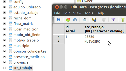 Para poder utilizar los nuevos SRC creados desde el plugin TopoDelProp, queda un último detalle. Hay que añadir los textos de los nuevos SRC a la lista de SRC del programa. Para ello únicamente hay que añadirlos a la tabla de la base de datos dom.src_trabajo (esquema dom, tabla src_trabajo). Añada solo el número del src en la columna src_trabajo. Si tiene cinco SRCs creados, deberá tener cinco filas en esta tabla.