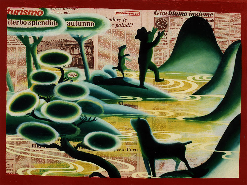 Psu Psi E (1995), Giochiamo insieme (1995), Sutri (1995). Pigmento y látex sobre papel encolado en tabla. 54 x 90 cm.