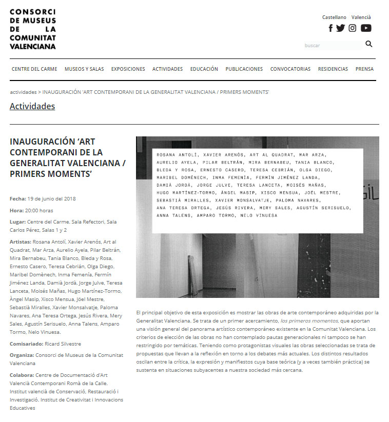 IV EDICION CALIMAR´T/1.1 UNIVERS_Centro Calima (Gilet_Valencia) Desde 15/6/2018_PDF UTOPIA STATION_Galería Utopia Parkway (Madrid) PRIMERS MOMENTS/ART CONTEMPORANI DE LA GENERALITAT VALENCIANA. Centro del Carmen (Valencia) Del 19/6 al 16/9/2018_ PDF PLEX_Museo de Bellas Artes de Castellón ESPAIS D'ART_Fundación Bancaja_Valencia ENLACE IMPACT10/LIBROS INTERVENIDOS DE LA UPV_Biblioteca central de Cantabria_Santander Del i al 10 de Septiembre_PDF1 PDF2 ARQUITECTURAS PINTADAS_Arquitecturas en la pintura española del siglo XXI_Roberto Mollá, Gonzalo Elvira, Jorge Tarazona, Dis Berlin, Marcelo Fuentes, Elena Goñi,Teresa Tomas, Angel Mateo Charris, Fernando Martin Godoy, Joël Mestre, Juan Cuellar, Paco de la Torre, Carlos Garcia Alix, Nelo Vinuesa, Damian Flores, Chema Peralta, Guillermo Peñalver. Del 20/10 al 12/11/2017 en Meinblau Projektraum_Berlín (Alemania)_ |