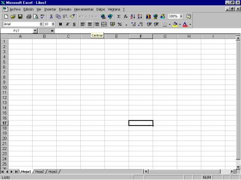 Este es el aspecto de la hoja de cálculo que te aparecerá en pantalla, una vez cargado el programa. Cada celda está situada en una columna y una fila, y se referencia indicando la columna y la fila en que se encuentra. Por ejemplo, en la figura está marcada la celda F17.