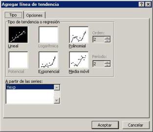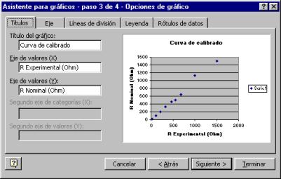 Seleccionada la opción "Gráfico", tendremos la posibilidad de elegir entre los tipos de gráficos disponibles, eligiendo el que consideramos mas conveniente para nuestras necesidades. En general nos interesará una representación en un sistema de coordenadas XY (dispersión XY) en la que se representen solo los puntos experimentales, sin escoger la opción de unirlos mediante rectas o curvas.