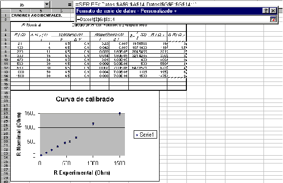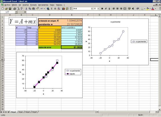 Solver buscará la solución óptima, que hemos representado en la gráfica inferior de la hoja: la recta que mejor se ajusta a los datos experimentales.