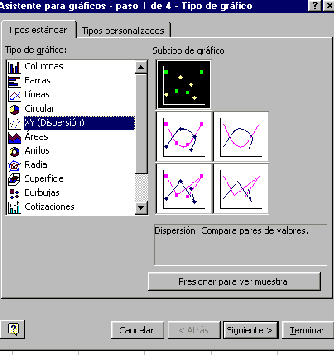 Seleccionada la opción "Gráfico", tendremos la posibilidad de elegir entre los tipos de gráficos disponibles, eligiendo el que consideramos mas conveniente para nuestras necesidades. En general nos interesará una representación en un sistema de coordenadas XY (dispersión XY) en la que se representen solo los puntos experimentales, sin escoger la opción de unirlos mediante rectas o curvas.