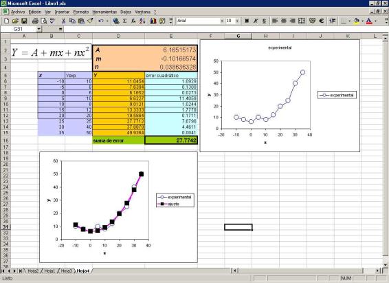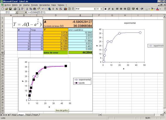 Solver buscará la solución óptima, que hemos representado en la gráfica inferior de la hoja: la recta que mejor se ajusta a los datos experimentales.