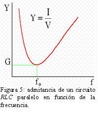 Por otra parte, si analizamos el circuito RLC paralelo, figura 5, se observa que la frecuencia de resonancia se corresponde con un valor mínimo de la admitancia o, lo que es lo mismo, máximo de la impedancia. Esto implica que ante una tensión aplicada la intensidad es la menor posible. De hecho la intensidad que entra en el circuito cuando se encuentra en resonancia tiene el mismo valor que la que circula por la resistencia. Esto no quiere decir que no circulen intensidades por el conjunto bobina-condensador, sino que estos se comportan como si de una malla independiente se tratase: las cargas del condensador cambian de una armadura a la otra circulando a través de la bobina. Puede suceder que se dé valores intensidad muy grandes que pongan en peligro el circuito. En este caso se habla de factor de sobreintensidades y su expresión es la inversa del factor de sobretensiones visto en el circuito anterior.