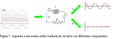 La figura 7 muestra los 10 primeros elementos de la serie de Fourier de una onda cuadrada y el resultado de su suma, que se aproxima, como era de esperar, a una onda cuadrada. De haber considerado todos los elementos de la serie, la onda cuadrada sería perfecta. La respuesta de un circuito, en función de sus componentes, puede tender a amortiguar las señales de alta frecuencia (opción a) o a amortiguar las de baja frecuencia (opción b), teniéndose en ambos casos una deformación de la señal resultante respecto a la onda cuadrada inicial. Este fenómeno puede ser no deseado y condiciona el diseño de circuitos y líneas de comunicación para conseguir una deformación mínima de la señal de entrada.