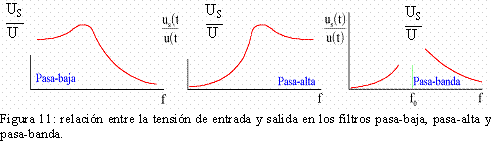 Si se realiza un barrido de frecuencias a la entrada del circuito, midiendo el valor de la tensión a la salida y se traza un gráfico en el que se represente la relación entre la tensión de salida y la de entrada, Us/U, en función de la frecuencia, se obtiene las curvas trazadas en la figura 11, para cada filtro.