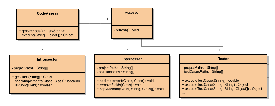 JavAssess is composed of four different modules, three of which can work in an isolated way. The three independent modules are classes that are located in the codeassess.javassessment package, and are called Introspector, Intercessor, and Tester. The fourth extra module internally uses the other three to exploit their functionality while allowing for combining their effects. It is implemented in the codeassess package by the CodeAssess class and it requires an instance of a class that should be written by the programmer. The programmer’s class must extend the Assessor class located in the codeassess.javassessment package and, by doing so, it automatically contains the three previously described modules. These modules internally make all the abstraction, which is made transparent for the user.
