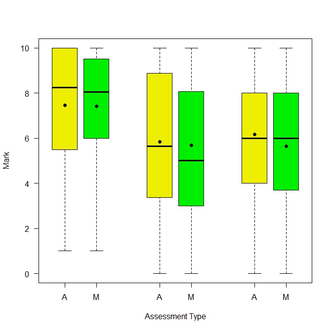 In these figures we see the distribution of marks in the same exam obtained by three different teachers (left figure). The yellow box represents the marks obtained with semi-automatic assessment, while the green box represents the marks obtained manually.