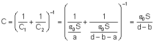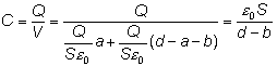 Cuando introducimos la lámina metálica (conductor) estamos descomponiendo el condensador en dos condensadores en serie, uno con una distancia entre armaduras a y el otro con una distancia d-a-b, de tal forma que la capacidad de la asociación es: