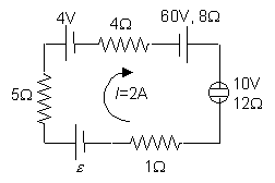 P2. Dado el circuito de la figura: a) Determina el valor de la fuerza electromotriz e para que la intensidad que circula por el circuito sea de 2A en el sentido indicado. b) Calcula la potencia generada y/o disipada por cada uno de los elementos del circuito. c) Calcula el rendimiento de cada uno de los generadores y motores del circuito. |
