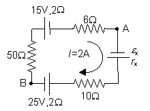 P3. Si por el circuito de la figura circula una intensidad I = 2A, en el sentido indicado, y el rendimiento del generador e x es del 90%. Determina: a) Los valores de e x y rx. b)Potencia disipada por efecto Joule en la resistencia de 6 W. c) Diferencia de potencial entre los puntos A y B del circuito. |