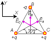 Sin embargo, la dirección del campo eléctrico es diferente para cada una de las cargas, tal y como indica la figura.