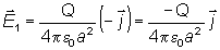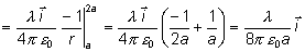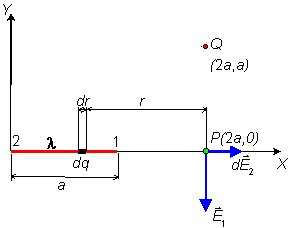 Ahora, para obtener el campo total tenemos que integrar esta expresión entre los puntos iniciales y finales de la distribución lineal. Dichos puntos están marcados como 1 y 2 respectivamente en la figura. Para el punto inicial 1 tenemos que el valor de r es a, y para el punto final 2, r es igual a 2a: