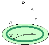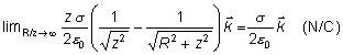 Observa que si en esta expresión tomamos el límite cuando el punto P está muy cerca del disco cargado, es decir, z << R, (y tomando un punto cuya coordenada z sea positiva), obtenemos: