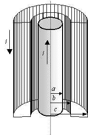 P8. Un cable largo coaxial está formado por dos conductores concéntricos, el interior macizo de radio a, y el exterior de radio interno b y radio externo c. Por los conductores circula la misma intensidad de corriente I pero de sentido contrario. Calcula el campo magnético para: