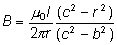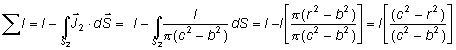 c) A una distancia b<r<c, la intensidad que atraviesa la circunferencia de radio r, es por una parte la intensidad del conductor interior y por otra, y en sentido contrario, la cantidad correspondiente a la corona cilíndrica del conductor exterior: