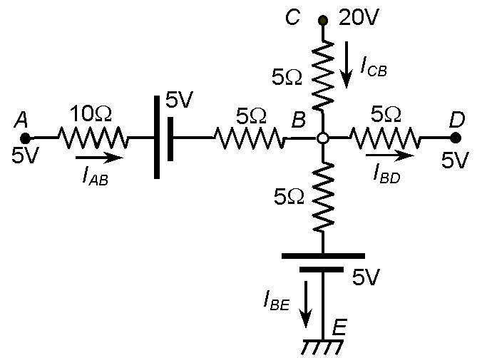 | P4. Dado el circuito de la figura, a) Determina las intensidades de rama IAB, ICB, IBD, e IBE mediante las leyes de Kirchhoff. b) Determina las intensidades de rama IAB, ICB, IBD, e IBE mediante el método de las mallas. c) Calcula el potencial en el punto B. |